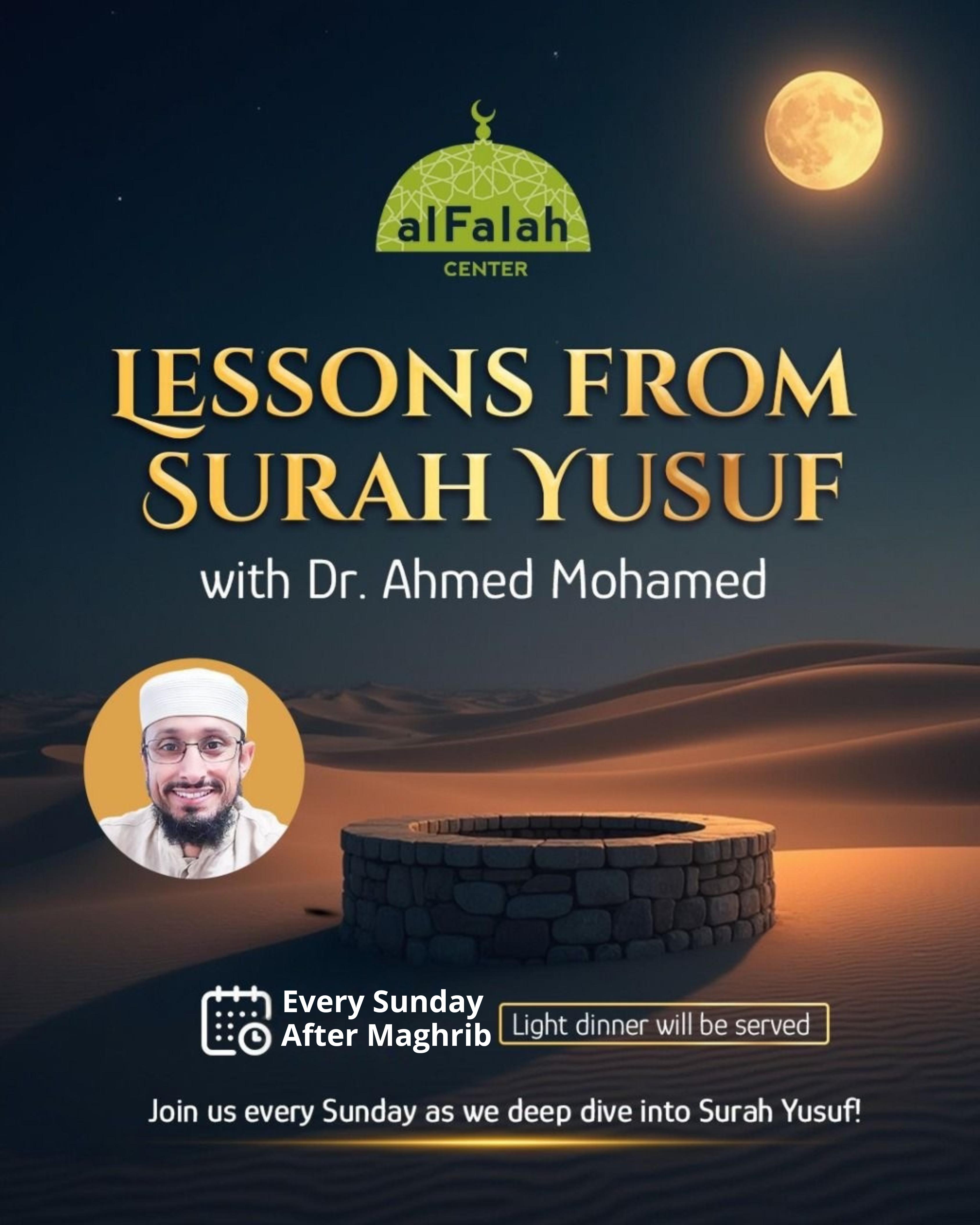 Join us after Maghrib for ”Lessons from Surah Yusuf” with Dr. Ahmed Mohamed.